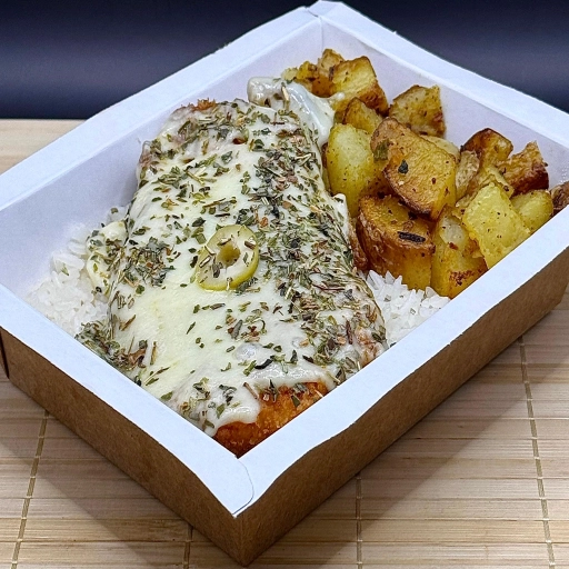300g - Filé de frango à parmeggiana (100g) + 2 Acompanhamentos a escolher (200g)
